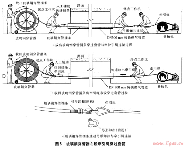 以下介紹以卷揚(yáng)機(jī)作為機(jī)械牽引動(dòng)力、以廢舊的DN 300mm鑄鐵燃?xì)夤艿雷鳛樘坠?、以NOD 200mm的PE燃?xì)夤艿肋M(jìn)行穿插套管的施工技術(shù)。