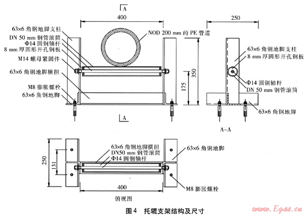 焊接完畢的待穿管PE管道,應(yīng)每隔5m設(shè)1組托輥支架對(duì)其進(jìn)行支撐。穿管作業(yè)時(shí),前行的PE管道帶動(dòng)滾筒圍繞軸桿轉(zhuǎn)動(dòng),接觸面呈滾動(dòng)摩擦狀態(tài),一方面可防止PE管道被地表硬物劃傷,另一方面可減小穿管時(shí)的摩擦阻力,加快穿管作業(yè)進(jìn)度,使PE管道沿預(yù)設(shè)的線路前進(jìn),不致于產(chǎn)生過大的偏移。托輥支架的結(jié)構(gòu)及尺寸見圖4。