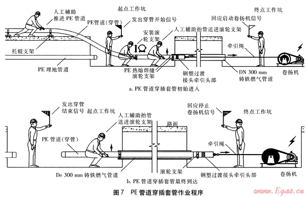 PE管道穿插套管的初始進(jìn)入、最終到達(dá)作業(yè)程序見圖7。PE管道穿插完畢后應(yīng)進(jìn)行壓縮空氣吹掃和強(qiáng)度、嚴(yán)密性試驗(yàn)。