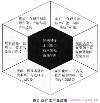 根據(jù)煤化工終端產(chǎn)品的不同,其重要性及配套政策也各不相同的。比如焦炭、電石及甲醇,因?yàn)樗鼈兌贾皇浅跫?jí)的煤化工產(chǎn)品,技術(shù)要求不高,產(chǎn)能已經(jīng)嚴(yán)重過剩,因此,合理控制新增產(chǎn)能,淘汰落后工藝就顯得尤為重要;而對(duì)于煤制氣,國家就采用了鼓勵(lì)政策,要求在資源豐富、煤價(jià)低的地區(qū)鼓勵(lì)發(fā)展;對(duì)于煤制油,因?yàn)槠渫顿Y需求巨大,技術(shù)風(fēng)險(xiǎn)相對(duì)較高,國家采取了嚴(yán)格監(jiān)管摸索前進(jìn)的方針(圖2)。