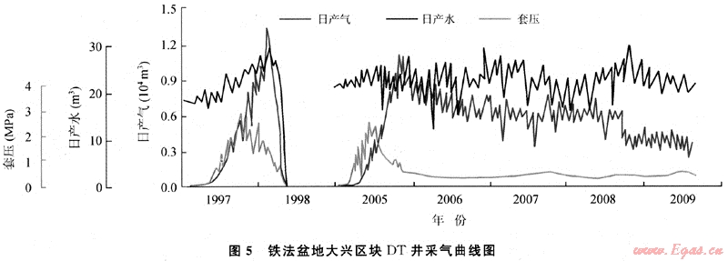 鐵法盆地大興區(qū)塊DT井為直井,1996年12月投產(chǎn),日產(chǎn)氣最高1.35×104m3,平均日產(chǎn)水21.8m3,生產(chǎn)15個月后關井,2004年重新開井,穩(wěn)產(chǎn)4a遞減,目前日產(chǎn)氣0.5×104m3,已累計采出1017×104m3,劃分為上升-穩(wěn)產(chǎn)-遞減3個階段(圖5),即阻礙-暢通-低飽和3個解吸階段。