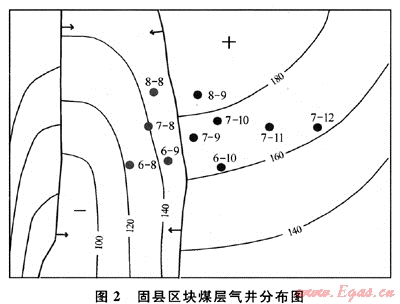 沁水煤層氣田固縣區(qū)塊投產(chǎn)10口煤層氣井(圖2),煤層埋深、厚度、頂?shù)装鍘r性、煤質(zhì)等參數(shù)基本相同,但排采效果差別大。6口高產(chǎn)井平均產(chǎn)氣量4115m3,產(chǎn)水量極小。4口未產(chǎn)氣井,產(chǎn)水量很大,累計產(chǎn)水1800~2800m3。其原因是10口井位于兩個不同的地質(zhì)單元,成藏條件不同;斷裂鼻狀構(gòu)造和斷裂背斜構(gòu)造軸部氣富水貧,斷槽內(nèi)氣貧水富:固6-10、7-9、7-10、7-11、7-12、8-9井6口高產(chǎn)氣井位于斷鼻和斷裂背斜軸部,煤層分布穩(wěn)定,頂?shù)装宸馍w條件好,含氣量高;而固6-8、6-9、7-8、8-8井4口未產(chǎn)氣井都位于兩條斷層夾持的斷槽向斜內(nèi)。由于小斷層發(fā)育,煤層連續(xù)性遭到破壞,含氣量降低,被稱為水槽,單井日產(chǎn)水幾十立方米。