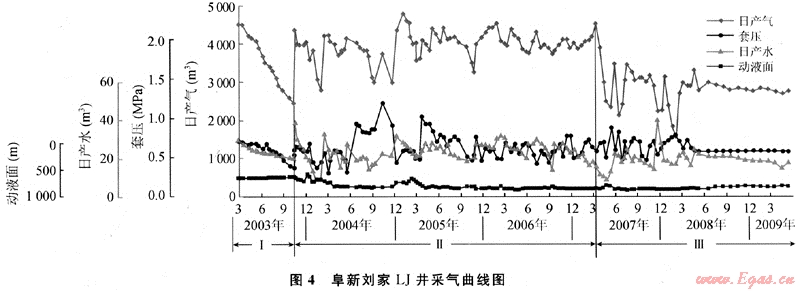 阜新劉家區(qū)塊LJ井2003年投產(chǎn)(圖4),初期日產(chǎn)氣4500m3,穩(wěn)產(chǎn)4a開始遞減,目前日產(chǎn)氣2780m3,已累計采出662×104m3,采出程度26.6%,預計采收率50%。解吸類型劃分為阻礙解吸(高液面)、暢通解吸、低飽和解吸3個階段。①阻礙型解吸:解吸速率大于降壓速率,氣泡變形,解吸困難;②暢通型解吸:解吸速率接近降壓速率,氣泡帶出部分束縛水,產(chǎn)量理想;③低飽和解吸:解吸速率小于降壓速率,應力閉合。從中國目前煤層氣開采現(xiàn)狀分析,直井第一階段一般小于1a;第二階段井距為300m×300m一般可采4~6a,與井距、煤厚和排采速度等有關;第三階段開采時間較長,羽狀水平井穩(wěn)產(chǎn)階段更短,為1~3a。
