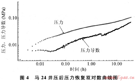 在馬24井為代表的壓后壓力雙對(duì)數(shù)曲線(xiàn)上,壓力與壓力導(dǎo)數(shù)成鐵軌狀,水力裂縫特征明顯,說(shuō)明壓后在地層中形成了主裂縫(圖4)。