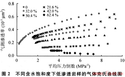 然而,低滲透巖樣氣體滲流受含水飽和度影響的同時(shí)也受到壓力、流速乃至界面阻力的作用。圖2表明,當(dāng)含水飽和度(Sw)小于50%時(shí),氣體滲流遵循其本身的非線性滲流特征,即存在慣性效應(yīng)和滑脫效應(yīng)的共同作用,克氏曲線形態(tài)與干燥巖心的克氏曲線形態(tài)一致。當(dāng)含水飽和度較高(Sw≥50%)時(shí),氣體滲透率與平均壓力倒數(shù)的關(guān)系曲線不同于常規(guī)克氏曲線,出現(xiàn)了類似于液體在低滲透儲(chǔ)層中的滲流特性,表觀滲透率隨壓力的增大而增大,此時(shí),巖心中的水所起的主要作用阻滯氣體的流動(dòng),使得氣體滲流出現(xiàn)“閾壓效應(yīng)”的特征。顯然,式(4)無法描述圖2所示的現(xiàn)象,為此提出低滲透氣藏氣水兩相運(yùn)動(dòng)方程,即