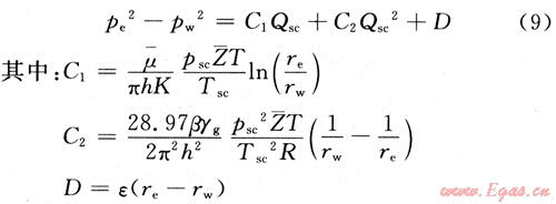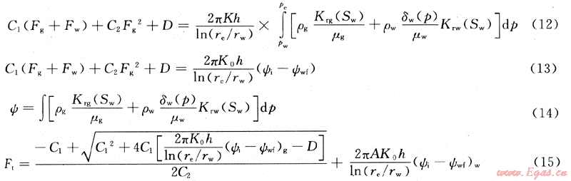 假設(shè)一口氣水兩相流氣井位于均質(zhì)、水平等厚的無限大地層中,儲(chǔ)層中發(fā)生氣、水兩相等溫滲流,符合非線性滲流方程式(5)、式(6),氣、水彼此互不相溶,忽略重力及毛細(xì)管力的影響。當(dāng)?shù)蜐B透多孔介質(zhì)中的流體遵循非線性滲流方程式(5)、(6)時(shí),氣體在低滲透多孔介質(zhì)中遵循二項(xiàng)式運(yùn)動(dòng)規(guī)律,即式(1),相應(yīng)的產(chǎn)能方程可寫為[7]: