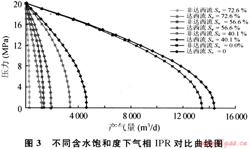 計(jì)算結(jié)果表明(圖3):低滲透砂巖儲(chǔ)層隨含水飽和度增加,氣井產(chǎn)能降低嚴(yán)重。當(dāng)含水飽和度為40%時(shí),氣井無阻流量的損失幅度約為干氣藏的70%,含水飽和度達(dá)到60%時(shí),氣井無阻流量的損失幅度約為干氣藏的90%??紤]低滲透介質(zhì)非達(dá)西滲流特征的氣體IPR曲線相對(duì)線性達(dá)西滲流特征的氣體IPR曲線小幅收縮,隨含水飽和度增加,由非線性滲流引起的產(chǎn)能損失逐漸減少。當(dāng)生產(chǎn)壓差較小時(shí),二者計(jì)算的氣井產(chǎn)量基本相同。