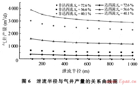 當(dāng)井底流動(dòng)壓力為10MPa、即生產(chǎn)壓差為10MPa時(shí),在同樣的泄流半徑條件下,隨著低滲透儲(chǔ)層含水飽和度的增大,氣井產(chǎn)能逐漸減小;在同樣含水飽和度條件下,隨泄流半徑的增加,氣井產(chǎn)量下降,氣井產(chǎn)量在泄流半徑小于200m的范圍內(nèi)下降幅度較大,大于200m以后,下降幅度減緩,當(dāng)泄流半徑超過300m后,氣井產(chǎn)量基本不再受泄流半徑的影響。在理論上低滲透氣井的合理井距應(yīng)布置在600m以內(nèi)為宜(圖6)。
