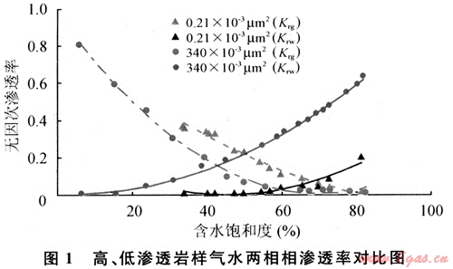 實(shí)驗(yàn)表明,較之于中高滲透巖心而言,低滲透巖樣氣相、水相最大相對(duì)滲透率值較小。氣、水共滲區(qū)域較窄,隨含水飽和度升高,水相相對(duì)滲透率上升緩慢,水相形成連續(xù)流動(dòng),而氣相無因次滲透率迅速下降接近于0,出現(xiàn)所謂的“水鎖”現(xiàn)象[3](圖1)。Muskat等人[5]建立的兩相滲流運(yùn)動(dòng)方程成立的前提是相對(duì)滲透率僅是含水飽和度的函數(shù),而不受壓力、流速以及界面阻力的影響。即