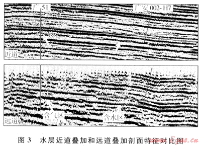 圖3是過廣51(工業(yè)氣井)和廣安002-H7(水井)的一條近道和遠道疊加剖面對比圖,從圖中看出,須六段氣層底的反射在遠道疊加剖面上的振幅明顯比近道疊加剖面振幅強,近道疊加剖面主要表現(xiàn)為中-中弱振幅、較連續(xù),而遠道振幅較強,但橫向上振幅強弱變化明顯,有時呈低頻、復波特征;反射軸時常出現(xiàn)上下起伏、零亂等反射特征。水層在近道疊加剖面和遠道疊加剖面上反射振幅都較強,同相軸較光滑,呈高頻、連續(xù)特征,遠道疊加剖面的反射振幅比近道略有增強,但與氣層相比,不明顯。