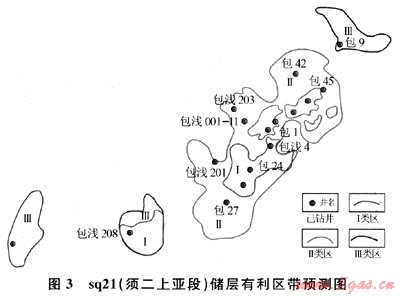 在對sq21(須二上亞段)進(jìn)行儲(chǔ)層分類評價(jià)時(shí),以儲(chǔ)能系數(shù)大于1、0.5~1、小于0.5分布作為Ⅰ、Ⅱ、Ⅲ儲(chǔ)層的分類依據(jù),以區(qū)塊內(nèi)是否有獲得工業(yè)油氣流井作為分類的劃分標(biāo)準(zhǔn)。Ⅰ類有利區(qū)位于鼻狀構(gòu)造上,儲(chǔ)層發(fā)育好,儲(chǔ)能系數(shù)大于1,且有工業(yè)氣流井;Ⅱ類有利區(qū)位于鼻狀構(gòu)造上,儲(chǔ)層發(fā)育較好,儲(chǔ)能系數(shù)為0.5~1,且有工業(yè)氣流井;Ⅲ類有利區(qū)位于鼻狀構(gòu)造之外,但儲(chǔ)層較發(fā)育,儲(chǔ)能系數(shù)在0.5~1。綜合評價(jià)出Ⅰ類有利區(qū)4個(gè),Ⅱ類有利區(qū)2個(gè),Ⅲ類有利區(qū)3個(gè)。Ⅰ類有利區(qū)塊位子包22井-包24井-包淺4井區(qū)、包21-包1-包淺001-6井區(qū)、包33井-包16井-包45井井區(qū)、包淺208井區(qū);Ⅱ類較有利區(qū)塊位于包淺201-包27井區(qū)、包淺203-包淺001-11井區(qū)、包42井區(qū)(圖3)。