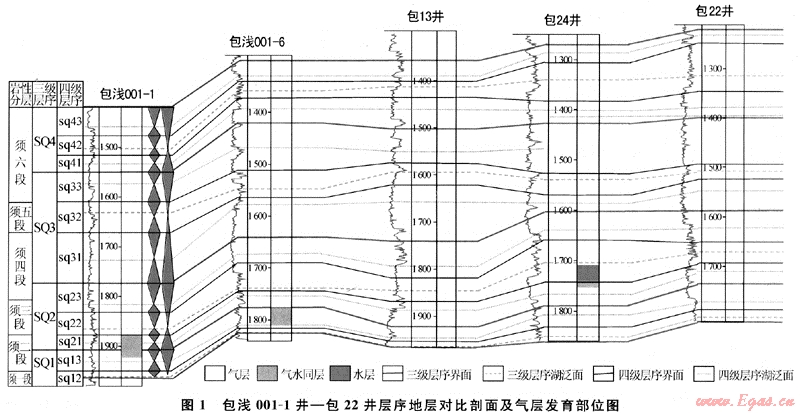 三級層序(SQ1~SQ4)的層序界面為不整合面或大型沖刷侵蝕面。層序界面在地震剖面中表現(xiàn)為削截與上超等反映地層不協(xié)調(diào)關(guān)系的地震反射,代表區(qū)域性的侵蝕間斷或無沉積型的間斷[2~4]。SQ1底界為須一段與下部嘉陵江組五段白云巖或雷口坡組二段石灰?guī)r的超覆不整合面。SQ4頂界為須六段與上部地層自流井不整合接觸面。SQ2、SQ3、SQ4的底界分別為發(fā)育于須二、須四、須六段大套砂巖內(nèi)部的大型沖刷侵蝕面[5~6],其主要特征為:①底部存在礫石或者泥礫,礫石有時(shí)有定向排列,有時(shí)雜亂無章,這種泥礫層在剖面上可連續(xù)追蹤,自然伽馬曲線呈箱形或鐘形,底部呈突變接觸關(guān)系;②發(fā)育大規(guī)模的起伏不平的侵蝕面,侵蝕底面明顯下切到先前的沉積體中,下切深度一般為1m左右;③有時(shí)存在風(fēng)化形成的黏土層或者菱鐵礦結(jié)核,此類現(xiàn)象出現(xiàn)在水上暴露的環(huán)境中;④有時(shí)存在大規(guī)模的植物莖干的堆積并且與其他巖性混雜在一起,此類現(xiàn)象一般發(fā)育在水下環(huán)境中的相對靜水湖灣地帶等;⑤有時(shí)發(fā)生物源的改變,比如由石英巖屑砂巖突變?yōu)殚L石巖屑砂巖,由于長石遭受風(fēng)化而在露頭剖面上形成一個(gè)松軟帶。