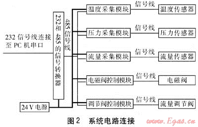 電路設計要根據(jù)測試系統(tǒng)中所選用的儀器儀表來進行。溫度測量采用德國原產溫度傳感器與變送器,Pt100精度等級1/3B,4線制;溫度測量范圍為0~150℃,具有響應時間短、測量精度高等特點,輸出信號4~20mA。流量測量采用德國原產ProcessMaster系列電磁流量計、五點標定后精度為0.2%。電磁流量計根據(jù)法拉第電磁感應定律設計,流量正比于介質流速和磁通密度,以及電極間的距離。電壓信號用變送器轉換成標準信號,方便數(shù)據(jù)采集,而且電磁流量計無節(jié)流部件,壓力損失小,減少能耗,只與被測流體的平均速度有關,測量范圍寬。只需經水標定后即可測量其他介質,無須修正,相比于浮子流量計精度大大提高。壓力測量采用德國原產壓力傳感器,測壓范圍為0~3MPa,精度為0.15%,輸出標準電流信號。燃氣消耗量測量采用日本品川濕式氣體流量計,既可以通過流量計的機械表盤讀取燃氣消耗量,也可以通過其發(fā)出的電信號經過處理后得到燃氣消耗量。燃氣壓力測量用壓力表量程為0~5kPa,輸出相應的電信號進行數(shù)據(jù)采集。流量調節(jié)閥選用電動調節(jié)閥,進行遠程控制。煙氣分析儀采用多組分煙氣分析儀,各組分都有對應的電信號輸出。數(shù)據(jù)采集模塊選用ADAM系列模塊對各參數(shù)進行高精度采集與控制。系統(tǒng)電路連接見圖2。