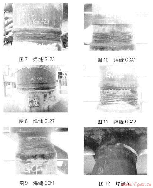 該鍋爐的設(shè)計(jì)結(jié)構(gòu)存在以下特點(diǎn):部分母材管件為三通式,連接方式為焊接連接,焊縫靠近三通管件的根部,且兩焊接件之間因壁厚不同,在焊縫附近形成不同程度的凸臺(tái)。我們篩選出12道典型的焊縫,焊接管道相關(guān)參數(shù)見(jiàn)表1,焊縫外觀見(jiàn)圖1~12.其中焊縫GL1的凸臺(tái)較小。由于凸臺(tái)與焊縫距離較近,導(dǎo)致無(wú)損探傷(射線、超聲波探傷)不能正常進(jìn)行。對(duì)于在安裝現(xiàn)場(chǎng)發(fā)現(xiàn)的問(wèn)題,由于新建電廠鍋爐多,設(shè)備外形較大、生產(chǎn)期長(zhǎng),鍋爐制造單位往往難以在限定的期限內(nèi)對(duì)設(shè)備進(jìn)行設(shè)計(jì)修改和現(xiàn)場(chǎng)改造。