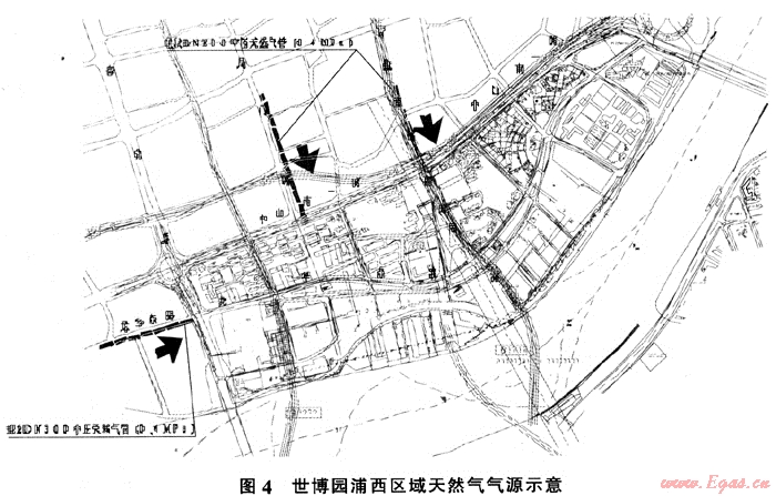 浦西世博園區(qū)天然氣氣源,由于受消防安全間距、管位、調(diào)壓站建設(shè)用地等條件的限制,規(guī)劃自漕寶路高中壓調(diào)壓站,延伸0.4MPa中壓管道至宜山路、斜土路,再從蒙自路、局門路、制造局路、西藏南路、保屯路以及南車站路路口接出,向園區(qū)的用戶供應天然氣。