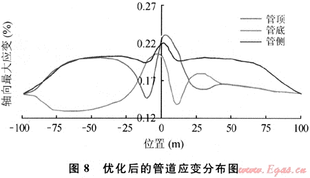 由2.2.1.2分析可知,該埋地管道的溝寬取1.9m比較經(jīng)濟。此時埋地管道的埋深取1.8m,管溝坡度取1:1,管溝內(nèi)采用彈性模量為1×105Pa的土壤回填。在上述條件下重新計算管道的應變(見圖8),和圖5比較可知,管道最大拉伸應變由0.33%降低到0.24%,降低了27.27%。