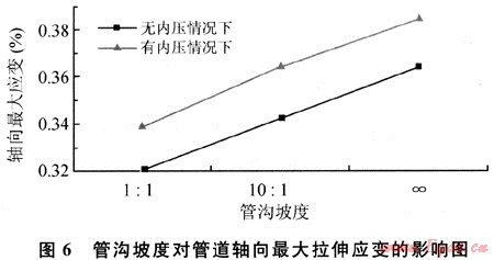 改變管溝坡度,計算得到的管道軸向最大拉伸應變值如圖6所示。計算結(jié)果表明:隨著管溝坡度的增大,管道所受的軸向拉伸應變分別以5.30%和7.01%的速率增大。
