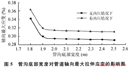 依據(jù)GB 50251—2003《輸氣管道工程設(shè)計規(guī)范》[8],深度在5m以內(nèi)時,溝底寬度應按下式確定:B=D+K,其中B為溝底寬度,m;D為管子外徑,m,該算例取1.219m;K為溝底加寬裕量,m,一般不少于0.5m。所以該算例中管溝底部寬度B≥1.719m(1.219m+0.5m),因此管溝底部寬度的最小值取1.8m。改變管溝底部寬度,計算得到的管道軸向最大拉伸應變值如圖5所示。結(jié)果表明:隨著管溝底部寬度的增大,管道所受的軸向最大拉伸應變減小,而且在從1.8m增加到1.9m時發(fā)生突變。由此可見管溝底部寬度取1.9m時比較經(jīng)濟,再寬挖的意義不大。