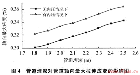 由于受凍土線的限制,管道埋深不宜淺于1.8m。改變管道埋深,計算得到的管道軸向最大拉伸應變值如圖4所示。計算結(jié)果表明:隨著管道埋深的增加,管道受到的最大拉伸應變有所增加。