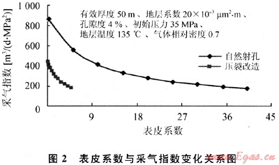 從模擬看(圖2),壓裂井表皮系數(shù)在0.3時,采氣指數(shù)與零表皮對比下降幅度在10%左右,由于壓裂井表皮系數(shù)普遍較低,因此表皮系數(shù)對壓裂井產(chǎn)能影響較小。射孔完井的井表皮系數(shù)一般較高,因此表皮系數(shù)對產(chǎn)能的影響較大,如果表皮系數(shù)達到20,則采氣指數(shù)與表皮系數(shù)為0時的對比下降幅度達到68%。有些射孔完井的井在試采中產(chǎn)量與壓力保持穩(wěn)定,關(guān)井后壓力恢復(fù)程度高,恢復(fù)速度快,但采氣指數(shù)并不高,與表皮系數(shù)的影響有很大關(guān)系。