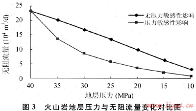 巖心實驗表明,火山巖儲層具有很強的壓力敏感性。以實驗數(shù)據(jù)為基礎(chǔ)數(shù)據(jù),假定儲層有效厚度50m,流動半徑700m,未考慮壓裂改造影響,采用擬穩(wěn)態(tài)氣井產(chǎn)能公式,分別計算了無壓敏影響和有壓敏影響下的氣井產(chǎn)能變化情況,從計算結(jié)果看(圖3),在考慮壓敏影響下隨著地層壓力的下降,氣井產(chǎn)能與無壓敏影響下的產(chǎn)能有較大的差距,最高損失達到70%。