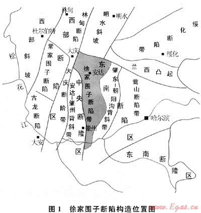 徐家圍子斷陷位于松遼盆地古中央隆起帶東部,面積約5350km2,斷陷在晚侏羅世-早白堊世早期形成。斷陷西部為斷階帶,中部為深洼帶,東部為斜坡帶。西側(cè)與古中央隆起帶結(jié)合部為一大型的基底斷裂面,該斷裂面高差為3000~5000m,寬6~13km。斷陷向東逐步抬升進(jìn)入肇東-朝陽溝隆起帶(圖1)。