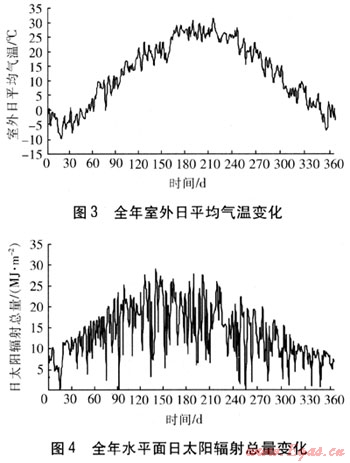 在模擬分析中,采用中國(guó)氣象局氣象信息中心提供的建筑熱環(huán)境氣象數(shù)據(jù)集中北京地區(qū)典型年的氣象數(shù)據(jù)[12]。全年室外日平均氣溫及水平面日太陽(yáng)輻射總量見圖3、4。由圖3、4可知,在非供暖期,室外溫度較高,太陽(yáng)輻射較強(qiáng),可以把這部分太陽(yáng)能儲(chǔ)存到地下坑槽中,供暖期再用熱泵提取,進(jìn)行供暖。在供暖期,太陽(yáng)輻射與建筑熱負(fù)荷在時(shí)間上不同步,供暖初期和末期,太陽(yáng)輻射較強(qiáng),室外平均溫度較高,熱負(fù)荷較小;供暖中期,室外平均溫度較低,熱負(fù)荷較大,太陽(yáng)輻射較弱。因此,在供暖初期和末期,優(yōu)先利用集熱器收集的太陽(yáng)能供暖,減少熱泵的耗電量,提高系統(tǒng)的性能。