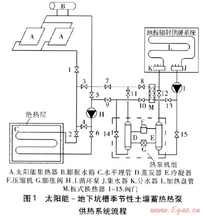 太陽(yáng)能-地下坑槽季節(jié)性土壤蓄熱熱泵供熱系統(tǒng)流程見圖1。