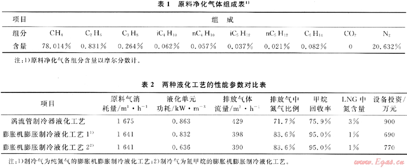 對比可知:①渦流管制冷器液化工藝的原料氣消耗量大于膨脹機膨脹制冷液化工藝,且有大部分冷氣作為循環(huán)氣,氣量為5080m3/h,即初始開車時系統(tǒng)中要多出5080m3/h的原料凈化氣(折合12120m3/d)。②渦流管制冷器液化工藝液化單元功耗高于膨脹機膨脹制冷液化工藝(尤其是當(dāng)膨脹機膨脹制冷液化工藝采用氮甲烷制冷氣時,渦流管制冷器液化工藝液化單元功耗高出36%)。③渦流管制冷器液化工藝排放氣體中的氮含量大于膨脹機膨脹制冷液化工藝,甲烷的回收率低,導(dǎo)致其LNG中氮氣的含量較大,如果按照小于1%含氮量(摩爾分?jǐn)?shù))的標(biāo)準(zhǔn)執(zhí)行,該工藝不能滿足脫氮要求。④從整個液化單元(包括原料氣壓縮、遇冷系統(tǒng)、循環(huán)氣壓縮)的設(shè)備投資來看,渦流管制冷器液化工藝由于要將氣體壓縮到20MPa,所需設(shè)備防爆等級較高,設(shè)備投資也約高出膨脹機膨脹制冷液化工藝15%。⑤但是渦流管制冷器液化工藝操作靈活,進入原料氣即可快速成液,生成LNG,這是其最大的優(yōu)越性。