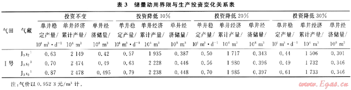 儲量動用的技術(shù)界限值(邊際值)不但與油氣價敏感,而且與投資成本也密切相關(guān)。在一定的范同內(nèi)適當(dāng)降低生產(chǎn)投資費用,利于難動用儲量開發(fā)經(jīng)濟效益的提高。表3為研究選用的Ⅰ號氣田儲量動用界限與生產(chǎn)投資變化關(guān)系表,由表3可算出投資降低20%時,儲量動用邊際值降低20%~22%。而當(dāng)氣價由0.9523元/m3上浮至1.143元/m3(也上浮20%時),儲量動用邊際值降低16%~17%,相比之下儲量動用的技術(shù)界限值與投資成本更敏感。因此,在分析難動用儲量的可動用性時是應(yīng)該油氣價格和投資兩方面的經(jīng)濟因素都要考慮。