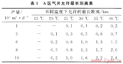 1) A區(qū)氣井的天然氣不伴熱直接進(jìn)站,不加熱直接脫水,可以取消采氣管道伴熱和站內(nèi)加熱工藝。不同產(chǎn)氣量和井口溫度允許采氣管道距離不同,其允許最長(zhǎng)距離見(jiàn)表1。