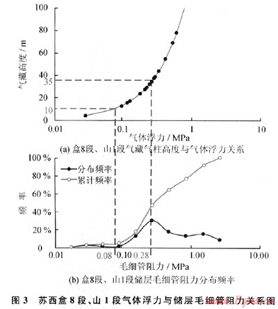 研究區(qū)區(qū)域構(gòu)造平緩,通過對大量盒8段、山1段氣藏剖面統(tǒng)計,滲透性好、橫向連通好的氣層連續(xù)高度主要分布在10~35m,一般不超過40m。根據(jù)上述公式計算得研究區(qū)盒8段、山1段氣藏天然氣向上浮力介于0.08~0.28MPa。