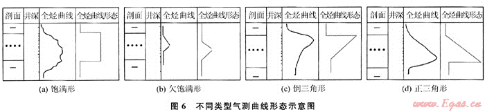 曲線形態(tài)包括:①飽滿形——全烴顯示厚度比儲層厚度大或基本相等,說明氣充滿了整個儲層,此形態(tài)最好,一般解釋為氣層;②欠飽滿形~全烴顯示厚度小于儲層厚度,儲層含氣不飽滿,上氣下水,解釋為氣水同層或差氣層;③倒三角形——曲線前沿陡,后沿緩慢回落,高點在上部,儲層頂部有少量游離氣,呈氣帽特征,解釋為氣層或含氣水層;④正三角形——曲線前沿緩慢爬升,后沿陡,高點在下部,水中溶解的氣欠飽和,頂部無游離氣,解釋為含氣水層或水層。