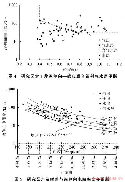 由于側(cè)向和感應測井測量原理不同,淡水鉆井液侵入水層、氣層后對其影響有很大不同。雙側(cè)向測井的測井值主要取決于儲集層高電阻率部分的貢獻;而感應測井的測井值主要取決于儲集層低電阻率部分的貢獻[3~4]。淡水鉆井液侵入水層時,侵入帶內(nèi)形成高侵電阻率剖面,由于側(cè)向測井受侵入帶高阻部分影響大,測量值明顯比實際值成倍增高,鉆井液愈淡、側(cè)向測井測量值愈高。而感應測井也反映高侵,但深感應測井受高侵侵入帶的影響相對較小,測量值增幅不大(與雙側(cè)向測井相比)。因此,在淡水鉆井液條件下,對于水層,受侵入影響不同,側(cè)向測井值比感應測井值升高更多,其比值(RILD/RLLD)應大于氣層的二者比值。故可以用側(cè)向-感應聯(lián)合解釋,以識別受鉆井液侵入影響的部分氣水層。據(jù)研究區(qū)感應一側(cè)向聯(lián)測的試氣井資料制作側(cè)向-感應聯(lián)合識別氣水層圖版(圖4),