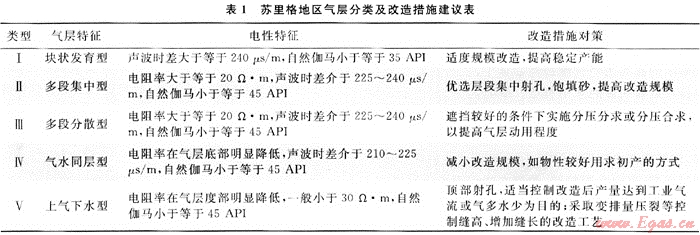 蘇里格地區(qū)砂體特征從平面上看儲層厚度、物性特征變化較大,非均質(zhì)性較強。從縱向上看:部分儲層含水,氣水關(guān)系復雜。針對此特點,結(jié)合試氣工藝方案的優(yōu)化,將蘇里格地區(qū)盒8段、山1段儲層按縱向砂體、氣層結(jié)構(gòu)的差異分成5類,分別提出了針對性的改造措施建議,以獲得更好的試氣效果(表1)。
