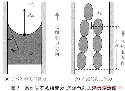 天然氣向上浮力(圖2-b)在儲層中的大小與氣柱連續(xù)高度和氣、水密度差成正比。計算公式如下: