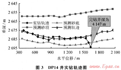 DP22井在水平段的氮氣泡沫欠平衡鉆進過程當中實現(xiàn)了隨鉆點火,火焰高4~6m,后效火焰高9~11m,油氣顯示非?;钴S。DP22井在井深3727~3906m井段伽馬值偏高,判斷為鉆遇泥巖夾層,后退至3470m處進行懸空下切側(cè)鉆,后鉆至井深4442m處完鉆,由于后退下切側(cè)鉆導致氮氣泡沫實鉆進尺超過1900m。在最后一趟鉆起鉆過程中出現(xiàn)了卡鉆事故。事故原因為沉沙卡鉆,最后一趟鉆總進尺為281.54m,平均機械鉆速為11.04m/h,在鉆井過程中伽馬值偏高,同時出口處沒有巖屑返出。圖7給出了DP22井氮氣泡沫欠平衡水平段實鉆軌跡。