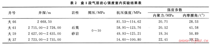 表2給出了盒1段氣層巖心強度室內(nèi)實驗結(jié)果,從表2中可以看出在圍壓為10MPa時,巖石的平均抗壓強度為116.8MPa,而通過模擬計算在氮氣介質(zhì)下的井內(nèi)最大應力為93.95MPa,因而不會出現(xiàn)井壁失穩(wěn)[7]。