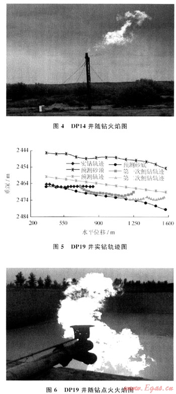 DP19井采用氮氣泡沫欠平衡鉆水平井技術(shù),實現(xiàn)了隨鉆點火,火焰高達3~5m。在欠平衡水平段的鉆井過程中由于兩次鉆遇大段泥巖,進行了兩次后退懸空下切側(cè)鉆繞泥,導致氮氣泡沫欠平衡實鉆進尺超過1500m,在整個欠平衡水平段鉆井過程中沒有出現(xiàn)井壁失穩(wěn)。圖5給出了DP19井氮氣泡沫欠平衡水平段實鉆軌跡,圖6給出了DP19井隨鉆點火情況。