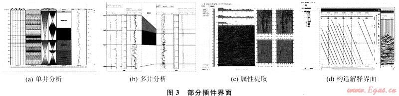 井分析插件包括合成記錄、地質層位標定、AVO分析、流體替換、交會分析等單井分析以及地層對比、砂體對比分析等多井分析功能。構造解釋插件主要包括速度場構建、2D/3D構造解釋、全三維可視化解釋、時深轉換等。屬性儲層預測插件包括常規(guī)屬性及特殊屬性提取、屬性優(yōu)化、儲層預測。地質繪圖插件包括數(shù)據(jù)網(wǎng)格化、等值線繪制、構造成圖等功能。圖3為插件的部分界面。