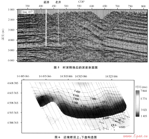 GeoMountain解釋軟件系統(tǒng)在10多個項目中得到了廣泛應用,取得較好效果。圖4為西部某工區(qū)構建的地下速度模型,經(jīng)時深轉換后得到深度剖面。由于準確的速度場構建,消除了時間剖面的構造假象,恢復了地下復雜構造的真實形態(tài)(圖5)。圖6為某層的逆掩斷層構造成圖,它同時刻畫了斷層上、下盤包括逆掩部分的構造形態(tài)。