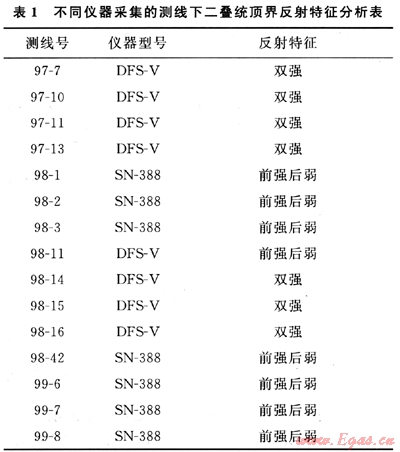表1列出了不同年度、不同儀器采集的部分二維疊加剖面下二疊統(tǒng)頂界反射特征。從表1中看出:SN-388采集的大多數(shù)測線陽新統(tǒng)頂界反射特征為前強(qiáng)后弱的單強(qiáng)相位,與三維剖面下二疊統(tǒng)頂界反射為單強(qiáng)相位特征相近。而DFS-V數(shù)字地震儀采集的大多數(shù)測線下二疊統(tǒng)頂界反射特征為雙強(qiáng)相位。由此得出:DFS-V儀器采集的二維資料與三維資料特征不一致,反射特征差異是由儀器響應(yīng)的不同而引起的。