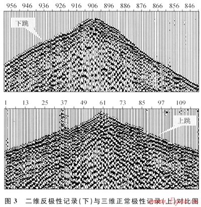 將二維單炮記錄反極性后與三維記錄對比,其反射特征與三維記錄特征接近,但初至明顯為上跳(圖3),這說明二維單炮記錄采集時(shí)的極性是正確的。