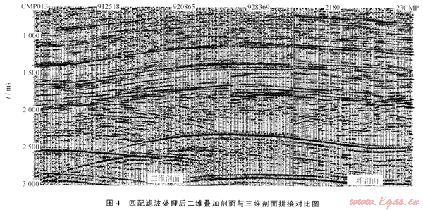 通過以上分析,認(rèn)為WBC構(gòu)造二維資料與三維資料特征差異的主要原因是由于不同儀器接收的原始記錄不同造成。采用反極性處理和匹配濾波處理兩種方式對二維剖面進(jìn)行相位調(diào)整,其特征與三維剖面均相近,但反極性處理存在約20ms的時(shí)差,且相位相反。匹配濾波處理無此現(xiàn)象,但是匹配濾波處理也有少數(shù)反射層特征不一致的地方。這可能是由采集的原始資料的差異所致。