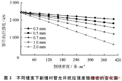 割縫縫寬大于2mm,隨著縫密的增加襯管強度急劇下降(圖2),常規(guī)割縫管不滿足本井堵漏材料的返排要求,應采用預孔襯管完井或下入帶ECP的割縫襯管酸化后投產(chǎn)。