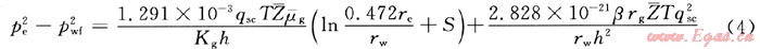 式中pc為平均地層壓力,MPa;pwf為井底流動壓力,MPa;為氣體偏差系數(shù);T為氣層溫度,K;h為氣層有效厚度,m;Kg為氣層有效滲透率,mD;為氣體黏度,mPa·s;qsc為標準狀況下的產(chǎn)氣量,m3/d;rw為井底半徑,m;re為供給半徑,m;β為速度系數(shù),m-1;S為表皮系數(shù);rg為天然氣的相對密度。