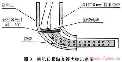 3) 目前尾管懸掛器座掛位置一般位于井斜30°左右處。因此,油管喇叭口在經(jīng)過(guò)該井段時(shí)其端面勢(shì)必緊貼套管內(nèi)壁,致使無(wú)法順利進(jìn)入懸掛器回接筒內(nèi)(圖3)。