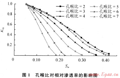 在孔隙結(jié)構(gòu)中,平均喉道半徑對(duì)滲透率的影響最大,這方面已經(jīng)有許多研究成果。這里主要討論孔喉比(孔隙半徑和與之連通的喉道半徑之比)對(duì)滲透率的影響。在模型中,保持其他條件不變,使孔喉比在2~7間變化,計(jì)算得到的氣相相對(duì)滲透率(Krg)與含水飽和度(Sw)的關(guān)系如圖1所示。