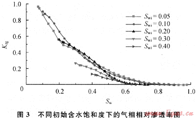 3) 初始含水飽和度對(duì)氣相相對(duì)滲透率有明顯的影響,隨著初始含水飽和度增加,氣相相對(duì)滲透率總體呈下降趨勢。