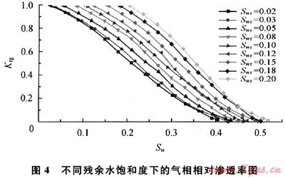 4) 殘余水飽和度對(duì)氣相相對(duì)滲透率的影響表現(xiàn)為,殘余水飽和度越大,氣相相對(duì)滲透率曲線越陡,下降越快。